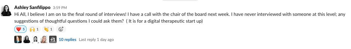 Wanted to share great momentum from our closed beta Women’s Health Slack community this week. I love seeing this community come together to support the women’s health careers of so many others.