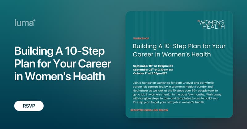 🔹 Upcoming Events — Don’t miss two big career-building opportunities: Building A 10-Step Plan for Your Career in Women's Health, and a Career Networking event built to link you with peers and leaders throughout the industry.
