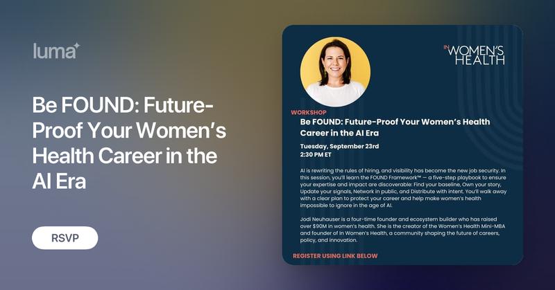 Want to go deeper? Join us for Be FOUND: Future-Proof Your Women’s Health Career in the AI Era. We’ll explore how AI is changing the rules of hiring and walk through the FOUND Framework™ — five practical steps to make sure your expertise and impact don’t get lost in the algorithm. You’ll also learn how to balance confidentiality in your current role with the need to share your brilliance, and why visibility is the new job security.
