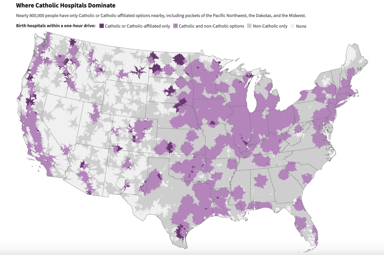 In Washington State, 50% the babies born in the state are born at a Catholic hospital. 4 of the 10 largest hospital chains in the nation are Catholic. In Iowa, nearly half of general hospitals in the state are Catholic or Catholic-affiliated, the highest share among all states.